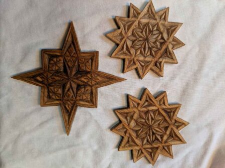 Chip Carving is an international tradition, although Scandinavia has the preponderance of carvings. It is a centuries-old craft, used by many peoples worldwide to decorate wooden objects—spoons, bowls, boards, doorways, boats, paddles, and more. Chip carving uses special knives to remove small chips of wood from a surface, to create sharp edges and smooth facets. The prettiest thing about chip carving is “the shadows” that are created by the carvings. Usually, the surface is flat, but it can be curved, round, or in other shapes.