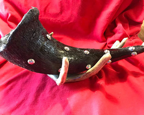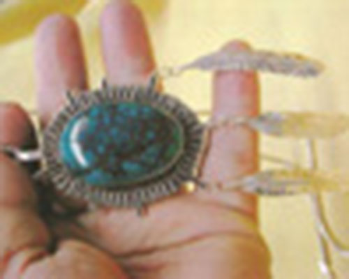 Jewelry, painted tipi doors, leather bags.